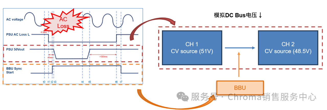 在環(huán)境模擬應(yīng)用中,憑借內(nèi)建的恒壓模式(CV Mode),系統(tǒng)可精準(zhǔn)重現(xiàn)服務(wù)器機(jī)柜內(nèi)DC Bus電壓動(dòng)態(tài)變化。用戶可透過通道設(shè)定:一通道維持 51V恒壓電流源,另一通道仿真48.5V恒壓負(fù)載端,完整再現(xiàn)機(jī)柜斷電時(shí)的運(yùn)行模式。當(dāng) AC 端斷電導(dǎo)致直流母線電壓由51V下滑至48.5V臨界值時(shí),系統(tǒng)將自動(dòng)觸發(fā) BBU介入,并全程監(jiān)控其響應(yīng)速度與放電效能。此一完整解決方案,能真實(shí)還原數(shù)據(jù)中心應(yīng)用場(chǎng)景,協(xié)助使用者提前驗(yàn)證BBU的效能與可靠性。