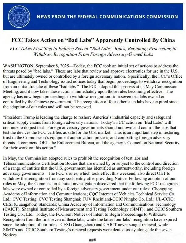 美國聯(lián)邦通信委員會(FCC)再次以所謂的“國家安全擔(dān)憂”為由,要撤銷對七家中國政府擁有或控制的測試實驗室的認可資格。這些被針對的實驗室,長期以來在全球電子產(chǎn)品檢測領(lǐng)域發(fā)揮著重要作用,負責(zé)測試、審評和認證進口美國并在美國營銷的無線電子設(shè)備,年檢測設(shè)備量達數(shù)十萬臺。
